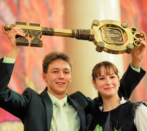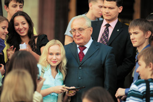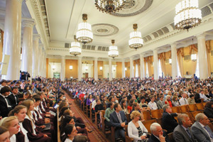 На Воробьевых горах шумно и весело. Здесь традиционно празднуют начало учебного года. В актовом зале Главного здания МГУ им. М.В. Ломоносова с обширной публичной лекцией для ребят выступает академик РАН, ректор МГУ профессор Виктор Садовничий. Вроде в церемонии – ничего нового, но если бы можно было услышать, как колотятся сердца вчерашних абитуриентов! В очередной, 255-й учебный год стены университета пополнили более 7000 новых студентов. МГУ всегда отличался неповторимой атмосферой «кипящей» научной и учебной деятельности в среде любознательных, увлеченных студентов и преподавателей. Перед залом первокурсники знакомились друг с другом. Один юноша рассказывал, как окончил школу экстерном, пройдя программу 9–11-х классов за год. Его соседка похвасталась, что училась сразу на двух разнопрофильных курсах, имея вместе с дисциплинами в общеобразовательной школе неимоверную нагрузку. Но, как она сказала, все было не зря. – Дорогие первокурсники, дорогие коллеги, вы стали студентами лучшего университета мира, – поздравил ребят ректор. Сейчас МГУ – это 40 факультетов, почти 400 кафедр, 15 институтов, 4 музея, научная библиотека в 9 млн томов, ботанический сад. Здесь работают 6000 профессоров-преподавателей, 3000 докторов наук, 250 академиков и членов-корреспондентов Академии наук. Здесь учатся более 40000 студентов, из которых 6500 – иностранцы из 89 стран. 5 филиалов вуза открыты в Севастополе, Баку, Душанбе, Астане. Университет готовится к запуску своего второго искусственного спутника «Татьяна-2». Создателями МГУ принято считать ученого-энциклопедиста Михайло Ломоносова, вельможу Ивана Шувалова и дочь Петра Великого – императрицу Елизавету. Она подписала указ о создании Московского университета 25 января в 1755 года в Татьянин день. Вуз возник не на пустом месте. Андреевский, Заиконоспасский монастыри в Москве и Славяно-греко-латинская академия – прямые предшественники университета. Здесь учились Фонвизин, Жуковский, Лермонтов, Грибоедов, Тургенев, Островский, Тютчев, Вавилов, Ландау, Келдыш, Кольцов, Лебедев, Докучаев, Вернадский, Зелинский, Колмогоров... Особый акцент в своей лекции ректор сделал на подробных биографиях философа Ивана Ильина, математиков Дмитрия Егорова и Николая Боголюбова, химика Александра Несмеянова. О каждом из них первокурсникам показали небольшой фильм. В перерыве, отвечая на вопросы журналистов, Виктор Антонович сказал, что в этом году МГУ принял на 200 человек больше плана. 60% из них – победители и призеры всероссийских и иных олимпиад. И у всех – высокий балл по ЕГЭ. 50% из общего числа первокурсников – иногородние. Самыми популярными у абитуриентов были факультеты естественного цикла, вычислительной математики и кибернетики... Участие в празднике приняли около шести тысяч первокурсников. Кроме того, приехавшие в гости знаменитые академик РАН кардиолог Евгений Чазов и «автор искусственного сердца» – немецкий кардиохирург доктор Роланд Хетцер получили звания почетных докторов МГУ. На торжественном собрании состоялась церемония посвящения в студенты. Новоиспеченные эмгэушники произнесли традиционную клятву студента Московского университета и получили из рук Виктора Садовничего символический Ключ знаний. Поздравили ребят первый заместитель мэра в правительстве Москвы Людмила Швецова, министр юстиции РФ Алек