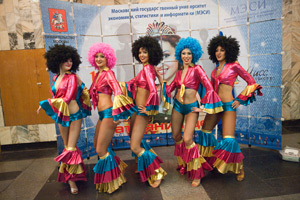 В ожидании конкурсаУже в фойе было на что посмотреть. Каждый из 22 вузов привез с собой что-то необычное. На стенде МГТУ помимо огромной стеклянной конструкции с фотографией участницы был представлен и 3D-постер претендентки на лавры победительницы. Любой желающий мог надеть специальные очки и познакомиться с трехмерным изображением Лолиты Танаджи. Возле стенда Академии ветеринарной медицины и биотехнологии им. Скрябина молодой человек по имени Эмин ловко выуживал пинцетом из огромной рюмки-аквариума аскорбиновую кислоту и раздавал ее желающим. Экспозицию МИИГАиК украшал огромный глобус, который можно было вращать руками. У стенда МИИТа зажигали молодые брейк-дансеры, собирая вокруг себя фотографов и болельщиков. У МГУПечати пели частушки, в которых говорилось о красоте, интеллекте и непременной победе Инны Булатовой. Тимирязевка привлекала самой громкой музыкой и парнем, танцующим тектоник. В 17:00 мы вместе со всеми зашли в зал, но тут нас ожидал неприятный сюрприз. На конкурсе у прессы было два вида бейджей – зеленые (у серьезных изданий) и оранжевые (для представителей студенческих СМИ). Почему-то организаторы посчитали, что последние вполне могут несколько часов постоять в конце зала, а фотографы сделают оттуда отличные снимки. Мы получали аккредитацию как представители студенческой газеты МГУП «Клише», поэтому нас постигла общая участь. Обидно, ведь мероприятие все-таки студенческое! Спас положение VIP-пригласительный, которым я запасливо обзавелся в своем профкоме. Нынешний конкурс, как и в прошлом году, включал пять испытаний – визитка, спорт, деловое дефиле, танец со звездой и самая красивая часть – дефиле в вечерних платьях. Утомленные официозомВедущим был певец Марк Тишман. А за «прокачку» зала отвечал DJ Сандер Жуков с радио «Мегаполис». Открыли церемонию коллектив «ДоМиСоль», а следом выступил балет Аллы Духовой «Тодес». Наконец под восторженные крики болельщиков появились 22 красавицы. Первое испытание – деловое дефиле. Затем наступило время официальной части, и Марк Тишман больше получаса представлял спонсоров и жюри. Это перечисление здорово всех утомило. Вернуть зал в чувство помогли аниматоры – молодые люди на боковых трибунах, запускавшие в зал «волну», и «перекличка» болельщиков. Те должны были кричать, свистеть, дудеть, махать флагами и всем, что принесли с собой. Зал просто закипел, и не напрасно – девушка, чья группа поддержки окажется самой громкой, получит титул «Мисс Поддержка вуза». На огромном экране был показан номер для SMS-голосования. Отправляя сообщения, зрители могли определить «Мисс зрительский симпатий».